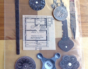 Nostalgiques by Rebecca Sower Scrapbooking Stickers, Architect Tools, Escutcheons, Old Keys, Blue Print Stickers, Antique Faucets,