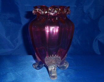 Victorian cranberry glass vase - Amphora shaped cranberry glass vase with simple wave pattern on ornate clear glass feet vintage home decor