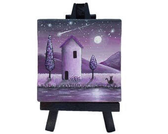 Dewberry Dreams - Miniature Original Acrylic Painting on 3 x 3 Canvas Includes Easel -Shooting Star,Moon,Mountain,House,Tree,Black Cat,River