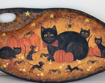 Primitive Folk Art Halloween Wall Hanging Pillow Sign Bat Broom Witch Hat Hand Painted