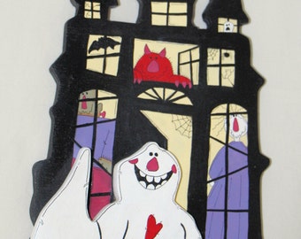 Halloween Fright House Wood Wall Decoration - Monsters Ghosts Handpainted Tole Decoration