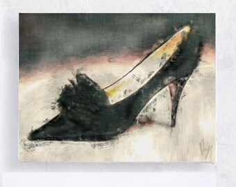 Fashion Art - Shoe Art - Still Life - Vintage Classic Black Heel - 5x7 Canvas Print on Block - Women - Dressing Room Art