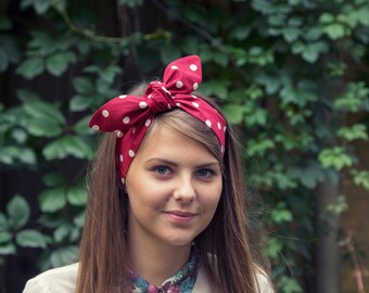 Red Polka Dot Tie Up Headscarf. Vintage Inspired Pinup Headband. Polka Dot Wire Headband. Rosie The Riveter Halloween Costume