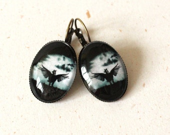Pegasus earrings, oval dangle earrings, equine jewelry, dark green flying fantasy horse earrings