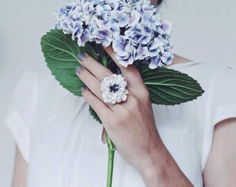 Statement flower ring with rough amethyst - sterling silver ring - floral jewelry - large ring - fine jewelry - handcrafted jewelry
