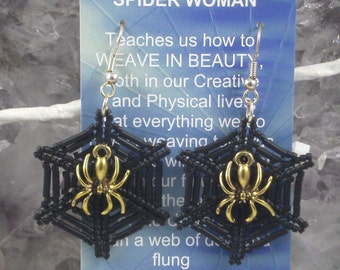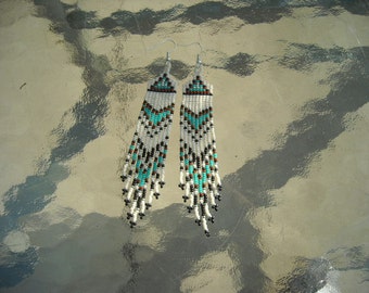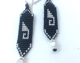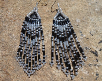 Black and Silver Handmade Brick Stitch Seed Bead Earrings, Hand Beaded, Native American Inspired