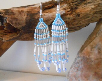 Hand Beaded Brickstitch Chandelier Earrings, Baby Blue, White and Silver, Handmade, Swarovski Crystal and Glass Seed Beads