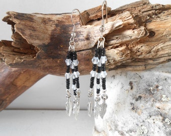 Black Seed Bead and Clear Swarovski Crystal Earrings with Silver Feather Dangles, Handmade, Native American Inspired, Hippie, Boho