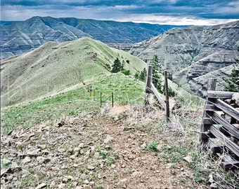 Mountain pass Photograph hiking oregon idaho west western landscape earth blue green peak wooden fence - Blazing a trail - fine art photo