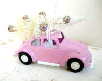 Vintage PINK Volkswagen Bug With A Glittered Bottle Brush Tree on Top, Christmas Ornament For The Vintage Lover on Your List