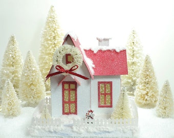 Putz Glitter House Christmas Decoration Vintage Style Victorian Pale Blue/Red Roof