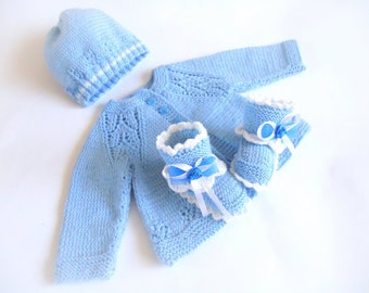 Baby Sweater Set Knitted baby boy set Blue baby set Knit baby set Newborn jacket Hat Booties Outfit Baby Gift Set Hand knitted Baby Cardigan