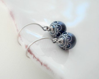 Navy Blue Pearl Silver Earrings. Wedding Jewelry, Drop Earrings, Bridesmaids Earrings, Classic Dangle, Gift For Her Under 25