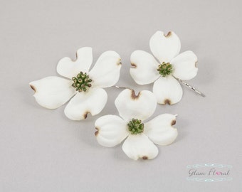 3 Dogwood Hair Flowers - Real Touch Off White/ Ivory/ Cream Dogwood, brown edging, natural green centers . Bobby Pins