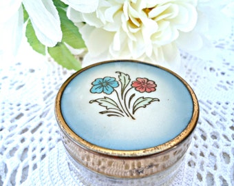 Vintage Glass Jar with Enameled Floral Lid - Trinket Jar/Tea Light Holder Blue Flower Lid