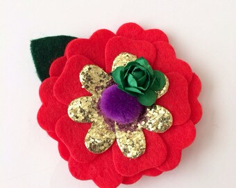 Summer Hair Clip, tomato red and purple hair clip, girls hair clips, meghan and Julie, handmade felt flower, gold sparkle