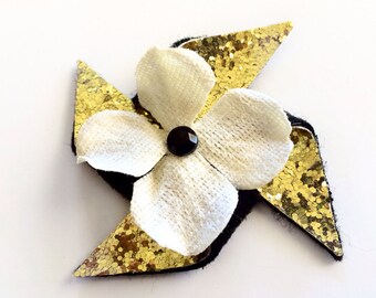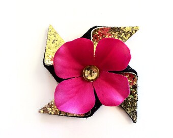 Black and Gold Pinwheel Hair Clip, Glitter gold and black hair clip, Black Gold and Fuchsia Pinwheel hair clip, Glitter Pinwheel.