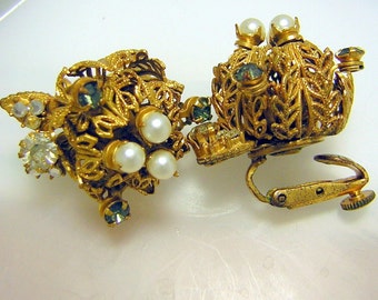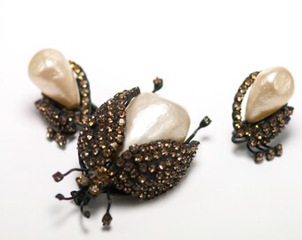 Vendome Baroque Pearl and Rhinestone Japanned Bug Beetle Insect Brooch Pin Earrings