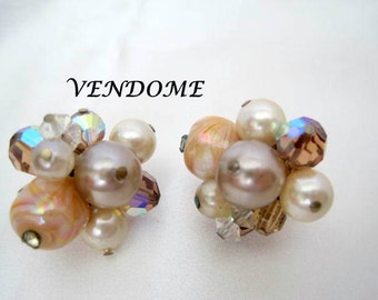 Pearl Crystal Art Glass Earrings Vintage 1950s Rhinestone Cluster Signed Vendome Coro Jewelry