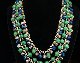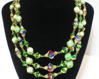 Vintage Vendome Three Strand Peacock Necklace, Made of Green Art Glass with Red and Blue Highlights, Enamel, 1960s