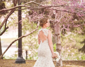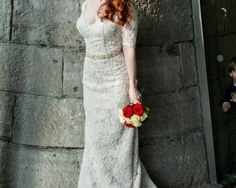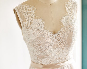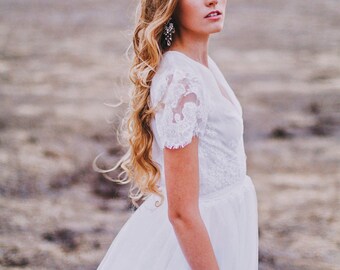 Lace and chiffon wedding dress, illushion neckline, deep V neckline, ivory wedding gown// Magnolia, Ready to ship sample EU36 size!