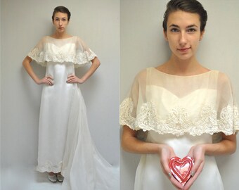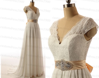 White/Ivory Lace Wedding Dress Handmade Chiffon Cap Sleeve Elegant V-Back Sweep Train Lace Bridal Gowns