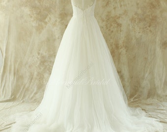 Lace Chiffon Wedding Dress Backless Open Back V Back Bridal Gown with Champagne Lining