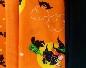 Vintage Fabric Lot of 4 Witch Bats Halloween Fabric Craft Quilt Cotton Fabric Fat Quarter Gorgeous