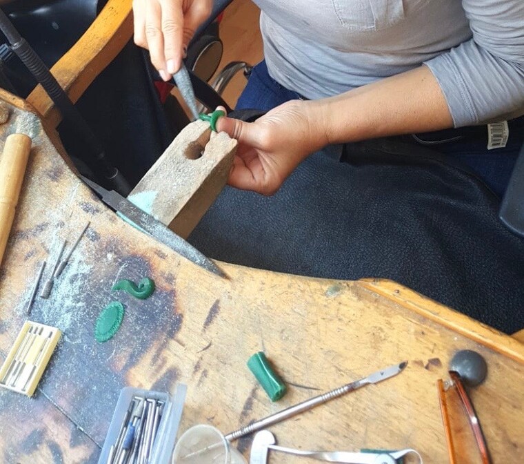 Solo trabajo con plata, ya que es sostenible y apta para reciclar. Algunas de mis piezas están esmaltadas y bañadas en oro (18k)/oro rosa sobre la base de plata.
