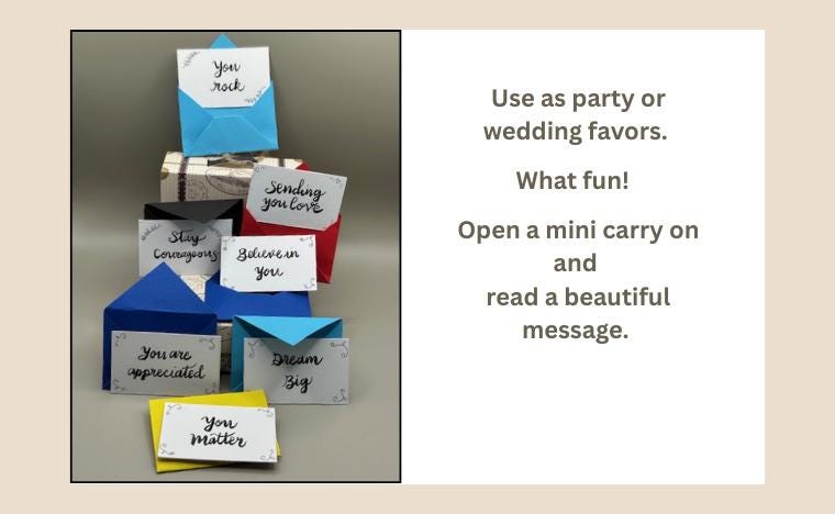 Use as party or wedding favors. What fun! Open a mini carry on and read a beautiful message.
