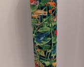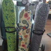 I have needed portable oxygen since 2003 and have been using different types of equipment. When I was switched to the silver and green size E (M-24) tanks, I think my mentioning occasionally how they weren't very pretty encouraged my mom to develop a pattern and make me a cover for a Christmas present 5 years ago. We worked on the pattern occasionally over the next few years and we created quite a stash of options for my tanks. After receiving compliments out and about, I finally decided to put some up for sale. I enjoy brightening the tanks of other people who require oxygen. I do try to keep quite a few tank cover options available on my page, but am happy to try and find something that would make your day better.