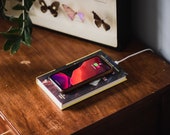 Les livres utilisés pour les chargeurs sont utilisés et parfois ils montrent plus que d’autres. Beaucoup de livres sont vintage, alors attendez-vous à des signes d’usure et d’âge (c’est ce qui les rend uniques et ajoute au look de toute façon, n’est-ce pas?). Le livre ressemblera à un livre, à l’exception d’un petit trou dans l’extrémité de la page pour le câble USB des chargeurs. Il n’y a pas de colle visible extérieure ou de marques de coupe car le livre a été collé de l’intérieur.
