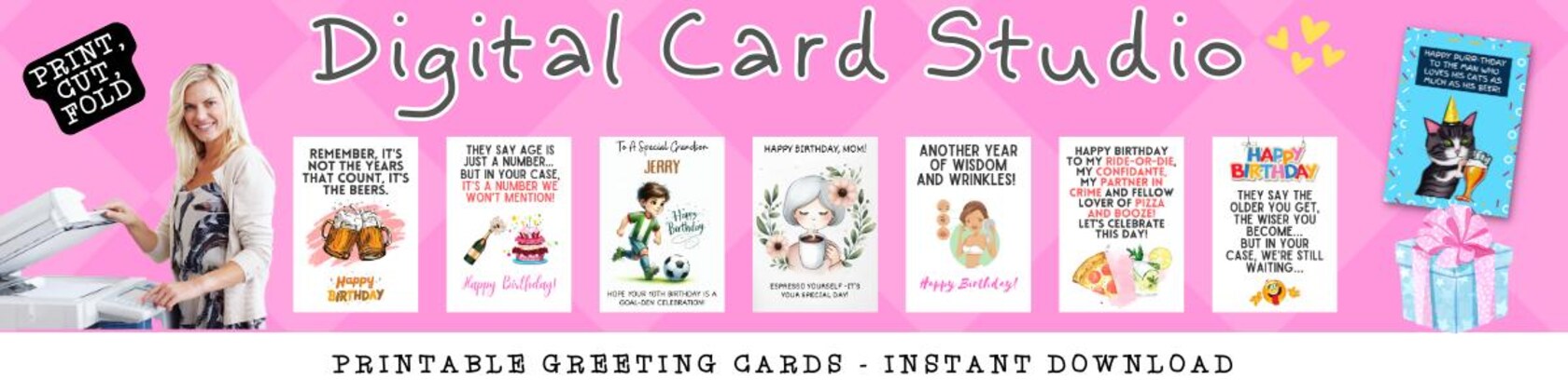 Welcome to my Etsy Store. I have a passion for graphic design, and creating printable greeting cards. All items in my shop are digital files that you can instantly download, print, cut, and fold. It's easy and affordable, plus you can print as many copies as you want. No shipping time or cost, just download and print.