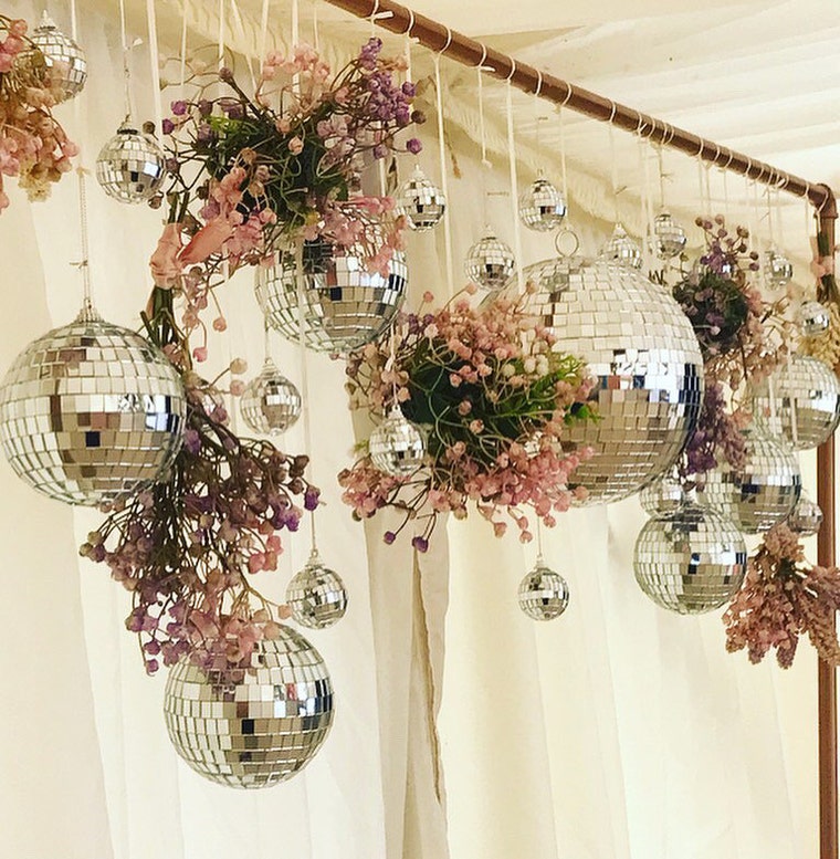 I loved creating this disco ball backdrop with florals to match our client's wedding decor -
