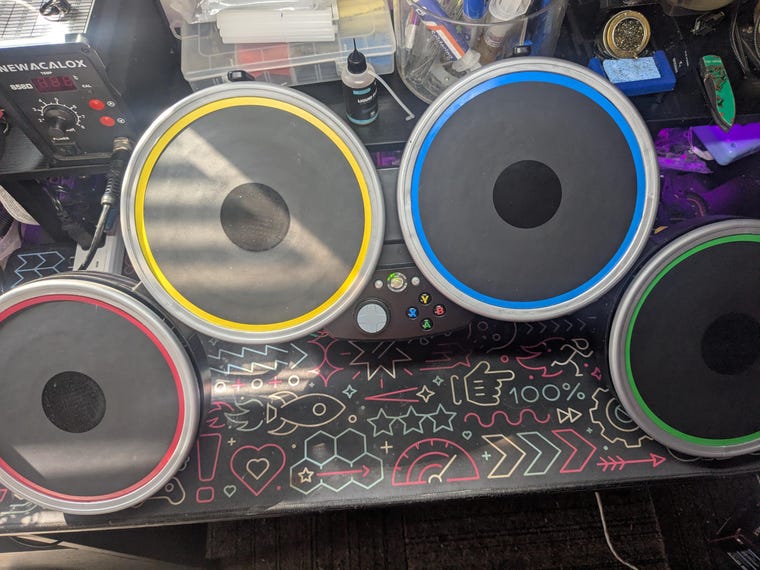 A repaired + refurbished Rock Band Drum kit