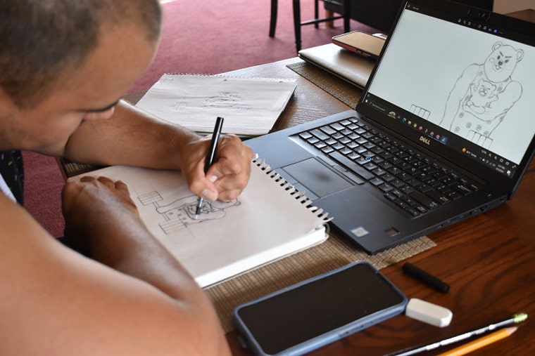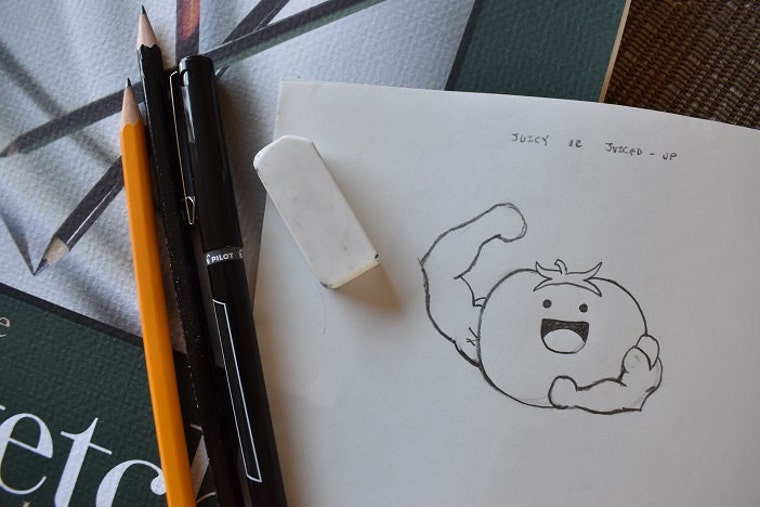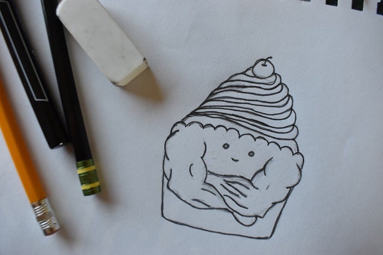 It first starts with a doodle, then a transfer, coloring, and then adding the design to a shirt or product. -