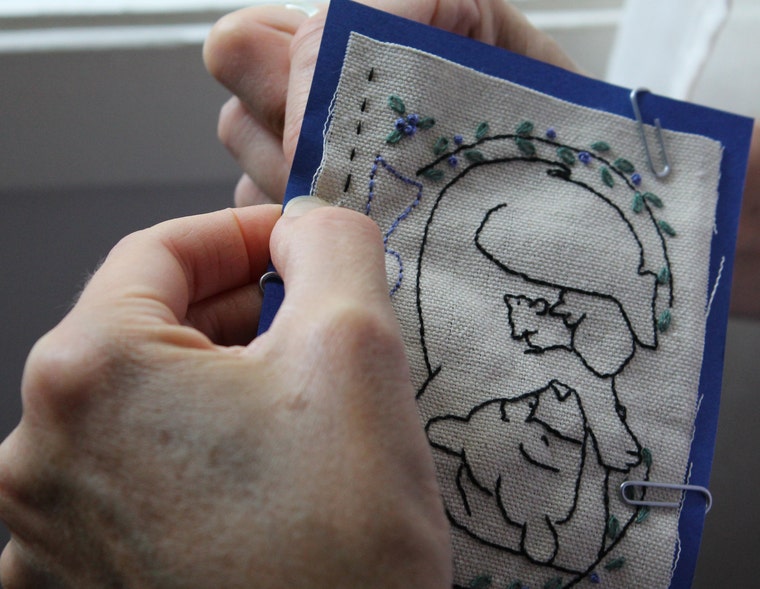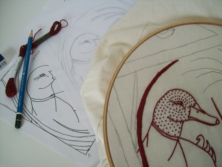 Meine Inspiration ist die Natur und mein Lieblingsteil des Prozesses ist das Zeichnen und Erstellen des ersten Entwurfs. Es macht auch Spaß, im Stoffladen unvoreingenommen zu sein und unkonventionelle Stoffe für meine Stickereien und Handarbeiten in Betracht zu ziehen, in Antiquitätenläden nach alten Handarbeitsbüchern Ausschau zu halten und dann verschiedene Stiche auszuprobieren.