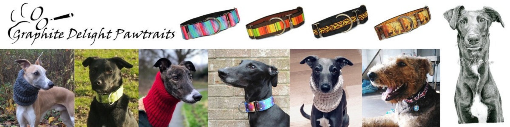 My dog Jett has been my inspiration to start this business, initially the pet portraits after I drew a picture of him which gained a fab response, then turned my hand to designing and making dog collars, sighthounds snoods and other accessories after making these things for him to wear with lots of compliments which I was truly humbled by. He is now my (very patient) model, and quality controller, always doing a brilliant job at making my products look great! You can see him in most of my product photos (getting greyer with the newer products!) - he gets paid handsomely in treats for his efforts!