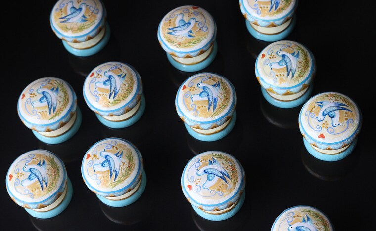 My knobs are hand painted in London with love. They are all my own designs, in the classic ‘British’ shape. I use the hi -