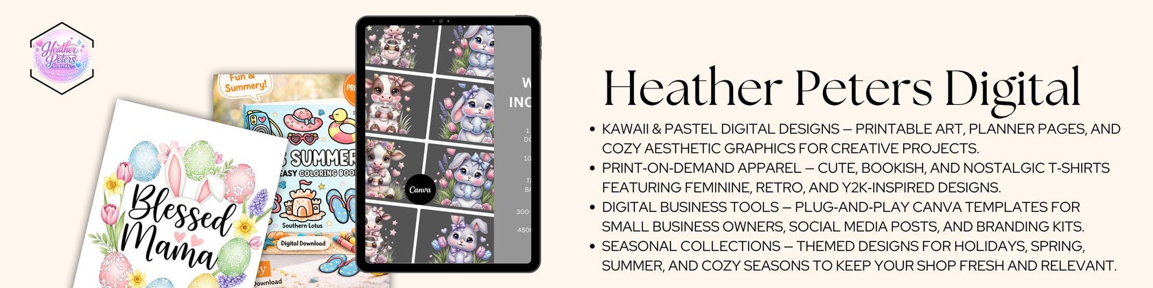 Welcome to Heather Peters Digital — a cozy corner of creativity where pastel dreams meet digital design. I’m Heather, a designer and creator who loves turning inspiration into adorable, functional art. My shop blends kawaii charm with professional polish, offering digital products and apparel that help you express your personality and brighten your everyday life.