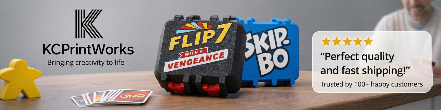 5 out of 5 starsLoving these 3D printed game boxes! We always upgrade our favorite games when we can, so it’s easy to throw in a bag when we are on our way to a game night or camping. The Flip7 with a Vengeance box fits the deck perfectly. Love the color combo and the composition of the box.