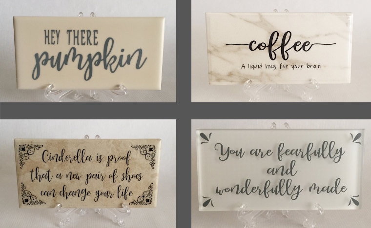 Small tile signs for home decor with inspirational or amusing quotes that are a great accessory for any room and are fun gifts to give friends, family, & everyone!