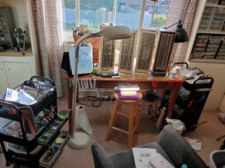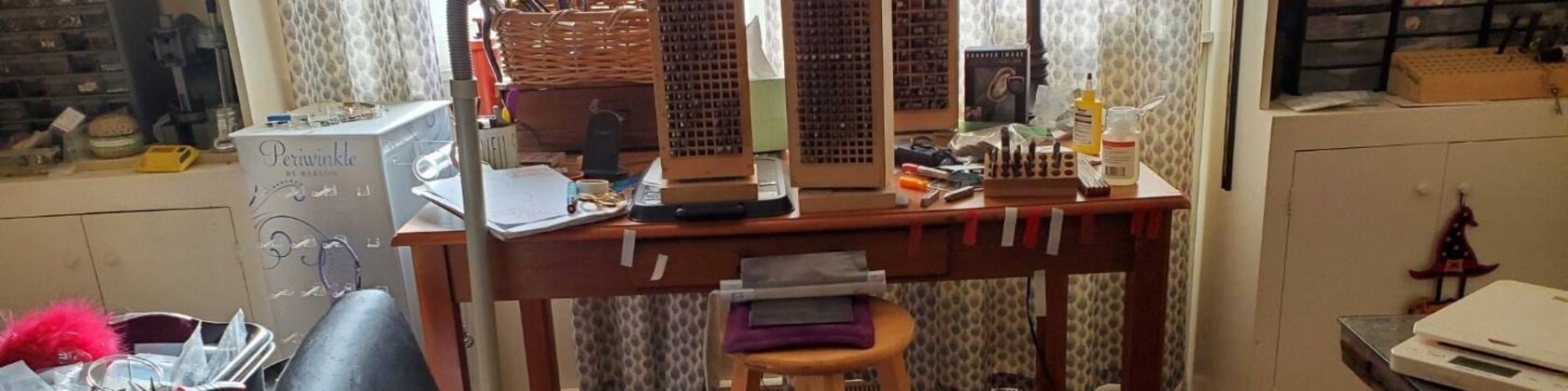 Workspace setup with my fonts and designs all displayed on my font spinners