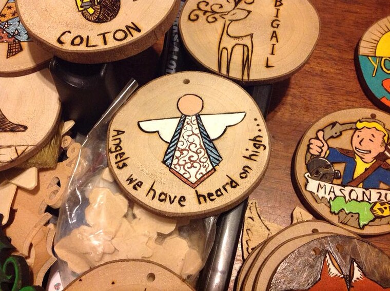 Most of our wood products, such as our ornaments, are made from locally harvested trees and branches right here in WV. I like the ability to salvage branches from tree trimmings and other activities where they would normally just be chipped into mulch or burned as waste. Our plywood "scrap" pieces are salvaged from local individuals doing cabinet making and furniture building. Most other materials are purchased locally when available.