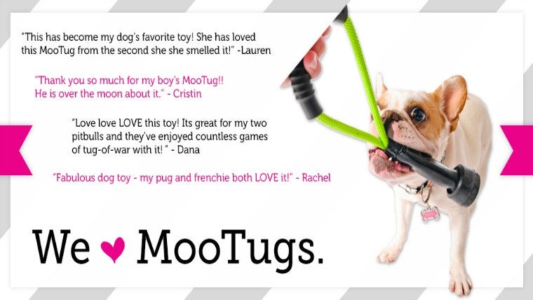 Nachdem Moose ein paar Schlepper gemacht hatte, beschloss er, sie zu teilen und alle wissen zu lassen, was für ein großartiges neues Spielzeug er geschaffen hatte. Seitdem hat er MOOTUGS auf der ganzen Welt verschickt. Sie waren in Australien, Japan, Kanada und Großbritannien! Moose, der auch ein nachdenklicher Kerl ist, beschloss, zu zahlen, wenn er weitergeht und einen Prozentsatz seines Umsatzes spendet, um anderen Hunden in Not zu helfen. Moosie, du bist ein guter Junge! Einschlag!