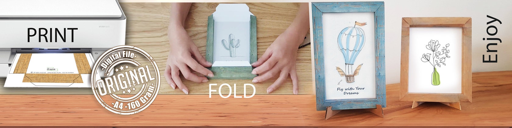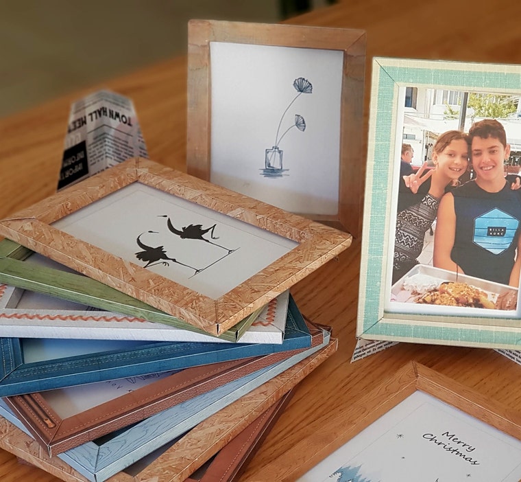 De todos modos, mi desafío fue imprimir en la impresora de mi casa, un papel que contendrá la pintura escaneada, así como el color y la textura del marco. Y con un simple diseño de "origami" se convertirá en un marco de imagen 3D