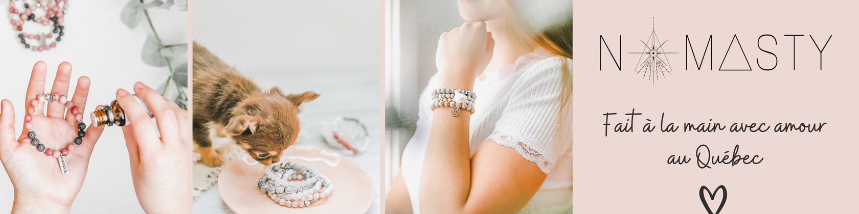 J’ai eu l’idée de créer Namasty lors d'une retraite de yoga en Tunisie, que j'ai gagné en mai 2018. Ce voyage était une chance incroyable, il m’a apporté calme, paix et harmonie dans les différentes sphères de ma vie. De retour au Canada, j’ai voulu créer quelque chose pour transmettre ce bien-être que j’ai ressenti, c’est la mission de Namasty. Chaque bracelet est fabriqué à la main avec amour ici au Québec. Les thèmes, les couleurs et les pierres semi-précieuses utilisées sont choisis minutieusement pour vous inspirer, vous accompagner, vous donner le sourire et apporter une touche de positif dans votre quotidien, pour que chaque jour, vous vous rappeliez à quel point la vie est belle 💓