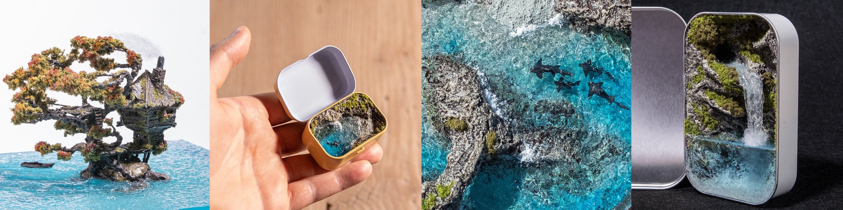 5 de 5 estrellasQué diorama tan exquisito. Me encanta tanto, tan, tanto. Retire la tapa de lata de caramelo e inmediatamente se verá envuelto en una hermosa pero aterradora escena costera. (Aterrador solo si no quieres salir de la playa y nadar en medio de tiburones martillo. Los tiburones son, por supuesto, hermosos, también, parte de la gloriosa naturaleza que se muestra). ¡Ojalá pudiera comprar cada pieza que hace este talentoso artista!