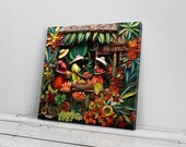 5 out of 5 starsThis beautiful artwork has images that vary from sharp and detailed (the wooden structure, dress designs and one woman’s visible features) to subtle and indistinct (the dark background and multiple flora) drawing you into a vibrant and colorful tropical scene.