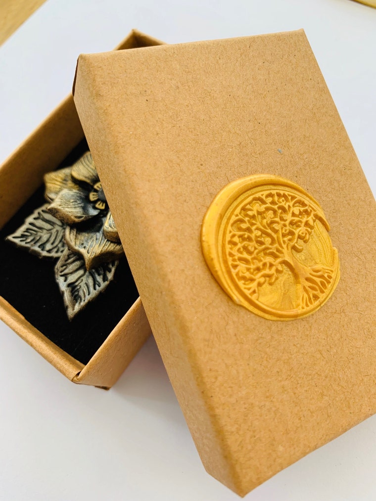 Adding a wax stamp - tree of life - to my gift boxes